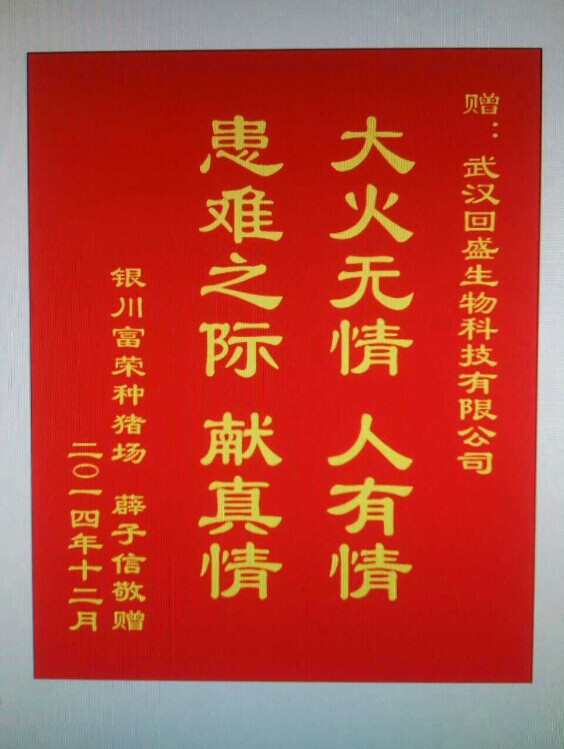 首先,请允许我代表宁夏银川富荣种猪场全体同事对8868体育公司表达最衷心的感谢!2014年12月9日深夜两点,由于线路老化种猪舍不幸失火,直接损失经产母猪88头,后备母猪200头,300多平米的种猪舍毁于一旦,经济损失达70万余。