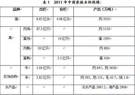 中国是世界上最大的食品动物养殖国,养殖规模大,养殖密度高,环境污染严重。据国家统计局,2011年中国肉类总产量7958万吨、奶3810万吨、禽蛋2811万吨、毛类45.5万吨、淡水产品2695.2万吨,具体如表1所示。