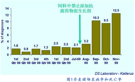 欧盟对兽用抗菌药在养殖业上的使用要求比较严格。瑞典是最早在饲料中禁止添加抗菌药物促生长剂的国家,从1999年7月1日起欧盟禁止杆菌肽锌、螺旋霉素、维吉尼亚霉素和泰乐菌素4种抗生素在畜禽饲料中作为生长促进剂使用,2006年1月1日起欧盟又禁止所有的抗菌药物促生长添加剂在养殖业上使用。然而禁止使用抗菌促生长剂对动物健康和动物福利产生了很大的负面影响,丹麦DANMP的报道(2000年)指出禁用后丹麦猪场的发病率和死亡率增加了600%,如图1所示。禁用后导致整个欧盟家禽的坏死性肠炎呈流行状态,饲料报酬下降,上市体重和整齐度降低,大大提高了生产成本。